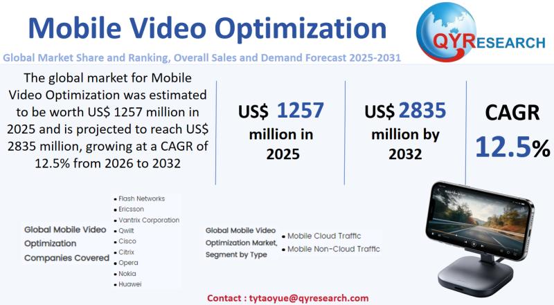 The global market for Mobile Video Optimization was estimated to be worth US$ 1257 million in 2025 and is projected to reach US$ 2835 million, growing at a CAGR of 12.5% from 2026 to 2032.