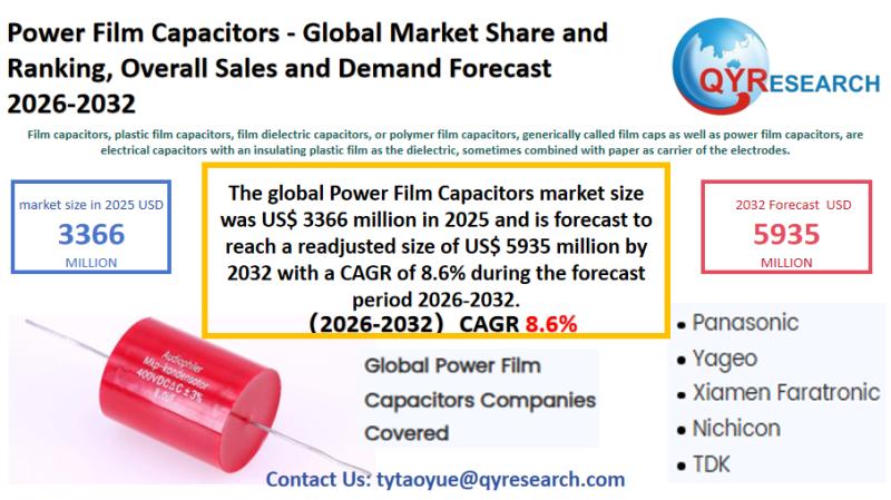 The global market for Power Film Capacitors was estimated to be worth US$ 3366 million in 2025 and is projected to reach US$ 5935 million, growing at a CAGR of 8.6% from 2026 to 2032.Global Leading Market Research Publisher QYResearch announces the release of its latest report "Power Film Capacitors - Global Market Share and Ranking, Overall Sales and Demand Forecast 2025-2031". Based on current situation and impact historical analysis (2020-2024) and forecast calculations (2025-2031), this report provides a comprehensive analysis of the global Power Film Capacitors market, including market size, share, demand, industry development status, and forecasts for the next few years.