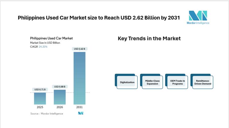 According to Mordor Intelligence, the Philippines used car market is projected to grow from USD 0.71 billion in 2025 to USD 0.88 billion in 2026 and is forecast to reach USD 2.62 billion by 2031, registering a CAGR of 24.30% during the forecast period. This strong Philippines used car market growth reflects shifting consumer preferences toward affordable mobility and flexible ownership options.