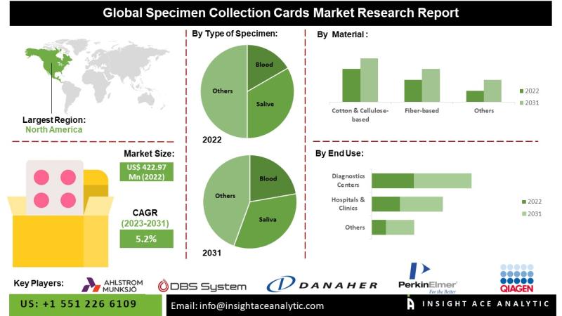 InsightAce Analytic Pvt. Ltd. announces the release of a market assessment report on the "Global Specimen Collection Cards Market- (By Type of Specimen (Blood, Saliva, Urine, Buccal Cells, Others), By Material (Cotton & Cellulose-based, Fiber-based, Others), By Product (Whatman 903, Ahlstrom 226, FTA, Others), By Application (New Born Screening (NBS), Infectious Diseases Testing, Therapeutic Drug Monitoring, Forensics, Research, Wellbeing/Health Monitoring, Other Applications), By Distribution Channel (Online, Offline), By End-Use Channel…