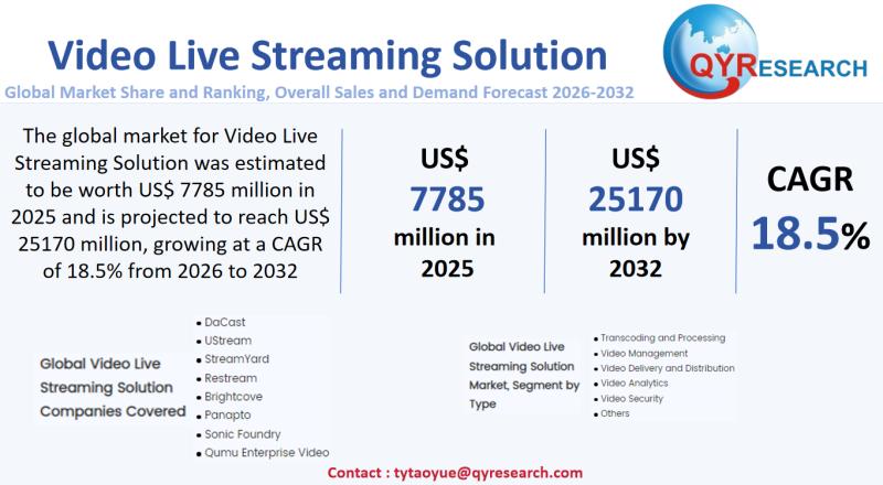 The global market for Video Live Streaming Solution was estimated to be worth US$ 7785 million in 2025 and is projected to reach US$ 25170 million, growing at a CAGR of 18.5% from 2026 to 2032.