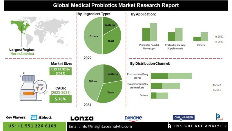 InsightAce Analytic Pvt. Ltd. announces the release of a market assessment report on the "Global Medical Probiotics Market - (By Ingredient Type (Bacteria (Lactobacilli, Bifidobacterium, Streptococcus, and Bacillus), Yeast, Spore Formers, and OthersBy Application: Probiotic Food & Beverages (Dairy Products, Non-dairy Beverages, Cereals, Baked Goods, and Fermented Meat Products), Probiotic Dietary Supplements, Probiotics for Women's Health, Infant Formula, and Others), By Distribution Channel (Hypermarkets/Supermarkets, Pharmacies/Drugstores, Specialty Stores, and Online Sales)),…