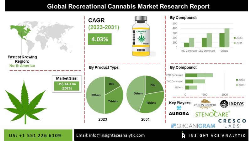 InsightAce Analytic Pvt. Ltd. announces the release of a market assessment report on the "Global Recreational Cannabis Market Size, Share & Trends Analysis Report By Product Type (Oils, Transdermal Patches, Tablets, Concentrates, Topical, Vape, Suppositories, Tinctures, Isolates, Flowers, Edibles, Capsules, Creams, Roll-Ons and Others), Compound, Application (chronic pain, cancer, mental disorder, sleep management and others), Region, Market Outlook And Industry Analysis 2034"