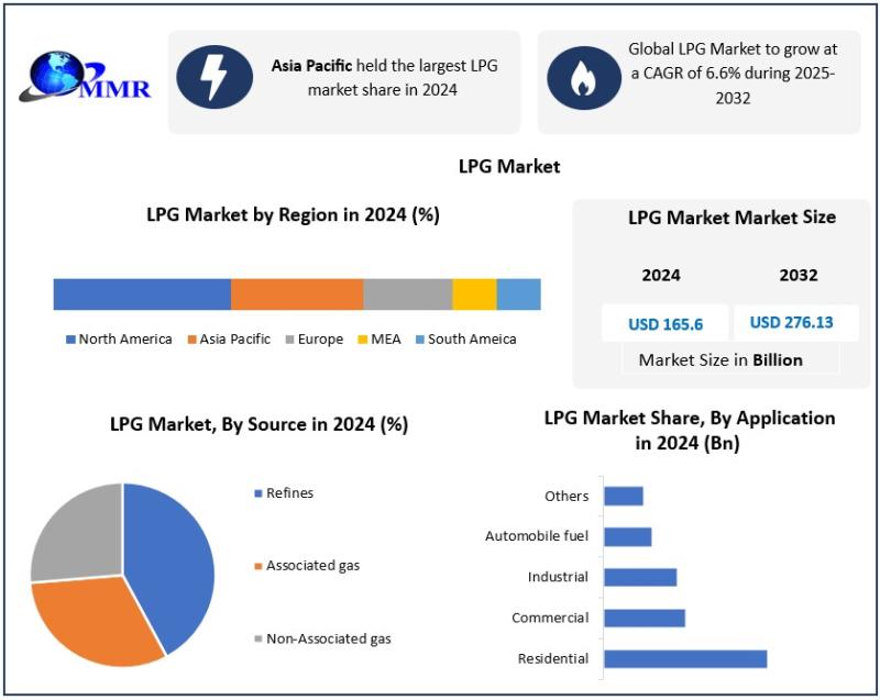 The LPG Market was valued at USD 165.6 Billion in 2024, and total Global LPG Market revenue is expected to grow at a CAGR of 6.6% and reach nearly USD 276.13 Billion from 2025 to 2032.