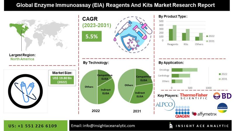 InsightAce Analytic Pvt. Ltd. announces the release of a market assessment report on the "Global Enzyme Immunoassay (EIA) Reagents And Kits Market- by Product Type (Reagents and Kits), Technology (ELISA, Indirect ELISA, Sandwich ELISA, and Multiple/Portable ELISA), Application (Infectious Diseases, Cardiology, Oncology, Bone and Mineral, Autoimmunity, Endocrinology, Toxicology, Neonatal Screening, Hematology, and Others), End-User (Hospital Laboratories, Clinical Laboratories, Pharmaceutical & Biotechnology Companies, Reference Laboratories, Academics and Others), Trends, Industry Competition…
