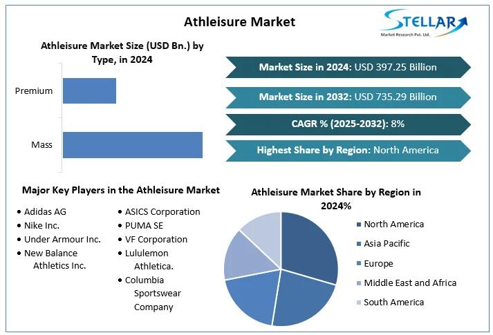 Athleisure Market was valued at USD 397.25 Bn. in 2024 Global Athleisure Market size is estimated to grow at a CAGR of 8% over the forecast period.
