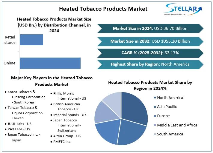 Heated Tobacco Products Market size was valued at USD 36.70 Bn. in 2025 and the total Heated Tobacco Products revenue is expected to grow at a CAGR of 52.17 % from 2025 to 2032, reaching nearly USD 1055.20 Bn. by 2032.
