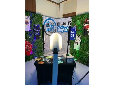 A vibrant, sports-themed event setup features the "MIA Photo Booth" station centered in front of a "For Jake We Tailgate" backdrop. The space is decorated with lush green artificial turf walls adorned with various iconic basketball jerseys, including