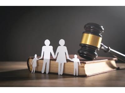 A symbolic image for family legal services featuring a wooden judge's gavel resting on a thick law book. Positioned in front of the book are white paper cutouts representing a family unit--a mother, father, and two children holding hands. The scene is set