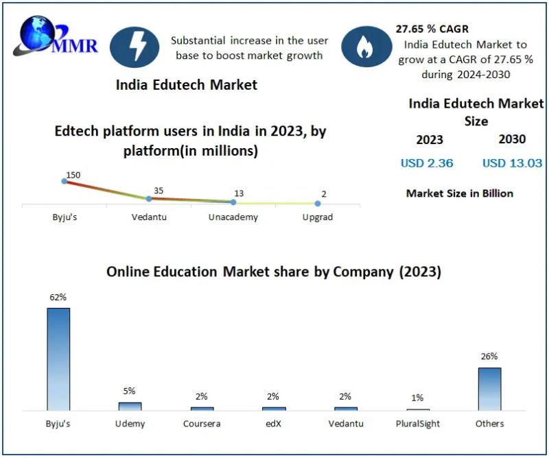 India Edutech Market size was valued at USD 2.36 Billion in 2023 and the India Edutech Market revenue is expected to reach USD 13.03 Billion by 2030, at a CAGR of 27.65 % over the forecast period.