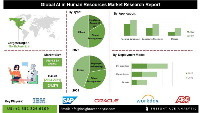 InsightAce Analytic Pvt. Ltd. announces the release of a market assessment report on the "Global AI in Human Resources Market - (By Type (Recruitment and Selection, Employee Onboarding, Performance Management, Talent Management, Workforce Planning and Analytics, Employee Engagement, Learning and Development), By Application (Resume Screening, Candidate Matching, Predictive Analytics for Employee Success, Skill Gap Analysis, Personalized Learning Paths, Employee Feedback and Sentiment Analysis, Succession Planning, Compensation and Benefits Optimization), By Deployment Mode (Cloud-based, On-premises), By Organization Size (Small and Medium-sized Enterprises (SMEs), Large Enterprises)), Trends, Industry Competition Analysis, Revenue and Forecast To 2031."According to the latest research by InsightAce Analytic, the Global AI in Human Resources Market is valued at US$ 4.3 Bn in 2023, and it is expected to reach US$ 25.0 Bn by 2031, with a CAGR of 24.8% during the forecast period of 2024-2031.