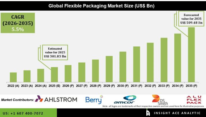 "Flexible Packaging Market" in terms of revenue was estimated to be worth $ 301.83 billion in 2025 and is poised to reach $ 509.48 billion by 2034, growing at a CAGR of 5.5% from 2026 to 2035, according to a new report by InsightAce Analytic.