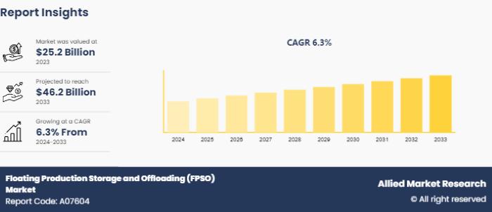 According to a new report published by Allied Market Research, the global floating production storage and offloading (FPSO) market was valued at $25.2 billion in 2023 and is projected to reach $46.2 billion by 2033, growing at a CAGR of 6.3% from 2024 to 2033. This growth reflects rising offshore oil and gas activities, increasing deepwater exploration, and the flexibility offered by FPSO systems compared to traditional offshore infrastructure.Download PDF Brochure: https://www.alliedmarketresearch.com/request-sample/A07604