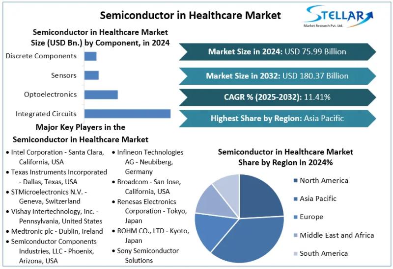 The Semiconductor in Healthcare Market size was valued at USD 75.99 Bn. in 2024 and the total Semiconductor in Healthcare Market revenue is expected to grow at a CAGR of 11.41% from 2025 to 2032, reaching nearly USD 180.37 Bn. by 2032.