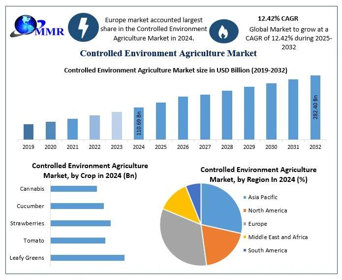 The Global Controlled Environment Agriculture (CEA) Market was valued at approximately USD 110.69 billion in 2024 and is projected to expand at a compound annual growth rate (CAGR) of 12.42% from 2025 to 2032, reaching nearly USD 282.4 billion by 2032.