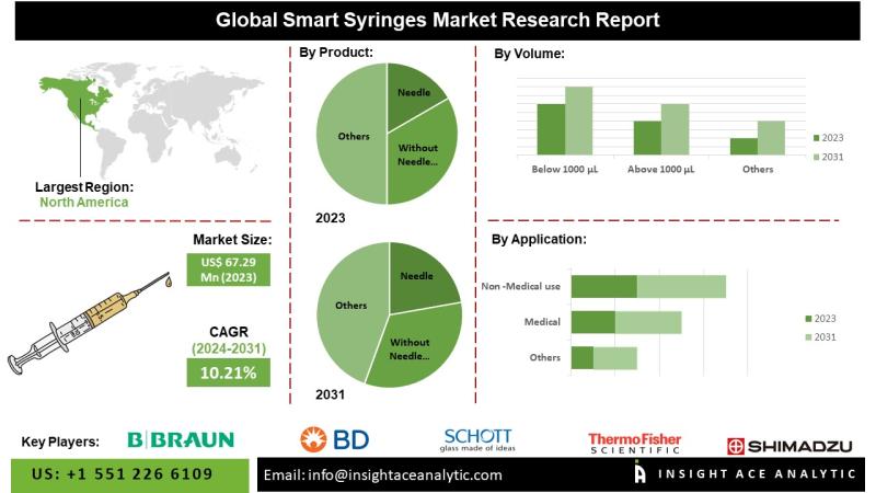InsightAce Analytic Pvt. Ltd. announces the release of a market assessment report on the "Global Smart Syringes Market- (By Product (With Needle (Fixed, Exchangeable), Without Needle Bioalcohols), By Volume (Below 1000 μL, Above 1000 μL), By Application (Medical (Drug Delivery, Blood Sample Collection, Vaccination), Non -Medical use )), Trends, Industry Competition Analysis, Revenue and Forecast To 2031."