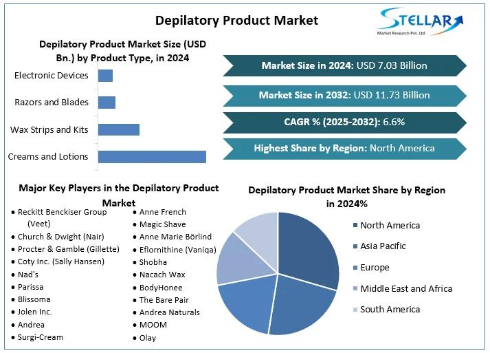 Depilatory Product Market Size was valued at USD 7.03 Bn. in 2024 and is expected to reach USD 11.73 Bn. by 2032 at a CAGR of 6.6% over the forecast period.