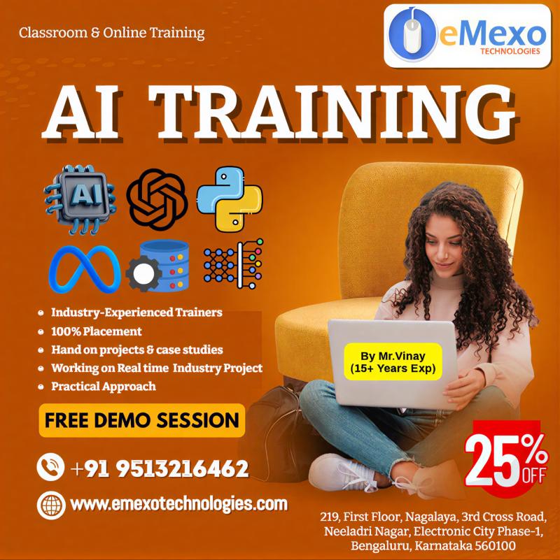 In addition to technical training, eMexo Technologies offers career guidance and project-based learning as part of its AI Training and Placement in Electronic City Bangalore initiative. Through this program, learners gain confidence, industry-relevant skills, and the support needed to pursue successful careers in the fast-evolving Artificial Intelligence domain.