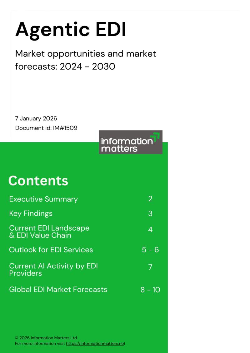 LONDON, 9 January 2026 - Information Matters Ltd today announced the release of its latest strategic analysis, "Agentic EDI: Market Opportunities and Market Forecasts 2024-2030," revealing a radical shift in the electronic data interchange (EDI) landscape. The report highlights how the emergence of autonomous AI agents is transforming traditional supply chain data exchange from a message-handling utility into an outcome-driven powerhouse.Since its inception in the 1960s, EDI has been the backbone of global logistics. However, the report warns that the $40 billion sector now faces an "Innovator's Dilemma". Established providers must decide whether to embrace agentic AI-autonomous systems capable of making decisions with little human oversight-or risk becoming irrelevant to AI-native entrants.