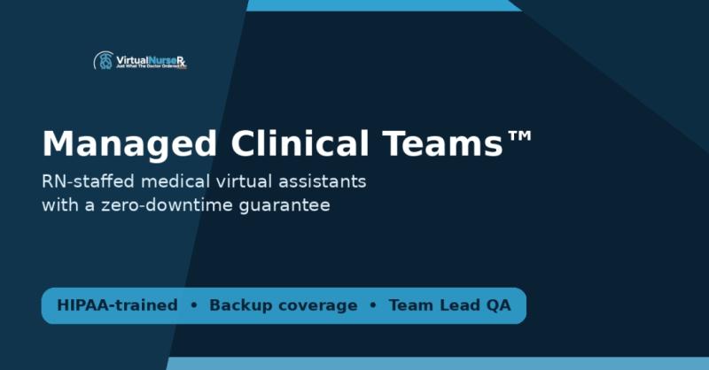Virtual Nurse Rx announced Managed Clinical Teams Trademark -RN-staffed medical virtual assistant teams with built-in backup coverage, Team Lead QA, and a zero-downtime guarantee-to help healthcare practices scale scheduling, billing, insurance verification, scribing, telehealth support and after-hours triage without staffing risk.