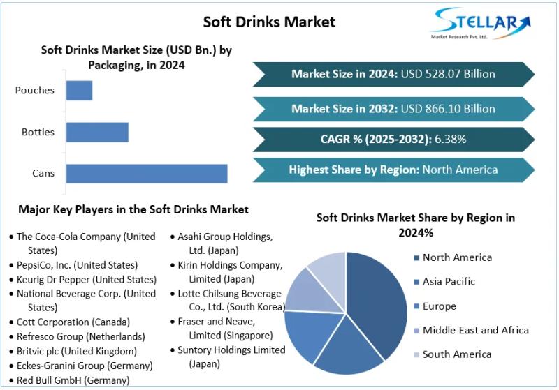 The Soft Drinks Market size was valued at USD 528.07 Bn. in 2024 and the total Global Soft Drinks revenue is expected to grow at a CAGR of 6.38% from 2025 to 2032, reaching nearly USD 866.10 Bn. by 2032.The Soft Drinks Market continues to sparkle with strong demand, evolving consumer preferences, innovative formulations, and expanding distribution channels. From carbonated beverages and juices to flavored water, energy drinks, and low-sugar alternatives, the industry is undergoing a powerful transformation. Changing lifestyles, premiumization trends, increasing health awareness, and rapid urbanization are reshaping how consumers perceive and consume soft drinks globally, positioning the category for sustained growth ahead.