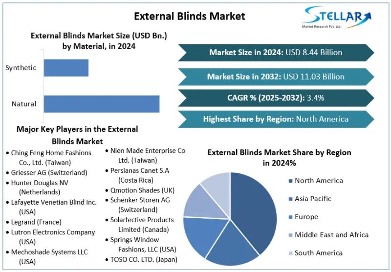 External Blinds Market is expected to grow at a CAGR of 3.4% during the forecast period. External Blinds Market is expected to reach USD 11.03 Bn. in 2032 from USD 8.44 Bn in 2024.