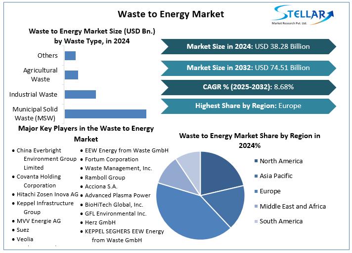 The Waste to Energy Market size was valued at USD 38.28 Bn. in 2024 and the total Global Waste to Energy Market revenue is expected to grow at a CAGR of 8.68% from 2025 to 2032, reaching nearly USD 74.51 Bn.
