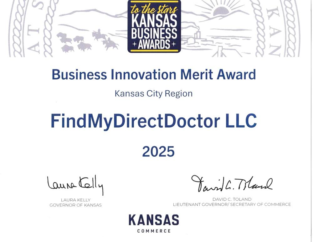 KANSAS CITY, Kansas. - FindMyDirectDoctor.com, a leading healthcare technology platform dedicated to expanding patient access to Concierge Medicine and Direct Primary Care (DPC), today announced it has been awarded the 2025 Business Innovation Merit Award for the Kansas City region. The honor was presented as part of the State of Kansas' prestigious "To The Stars: Kansas Business Awards" program.Championed by Governor Laura Kelly and the Kansas Department of Commerce, the To The Stars awards recognize companies that demonstrate exceptional ingenuity and a commitment to advancing the state's economy through innovative services and community impact. The awards celebrate the Kansas motto, Ad Astra per Aspera, highlighting businesses that overcome challenges to reach new heights.