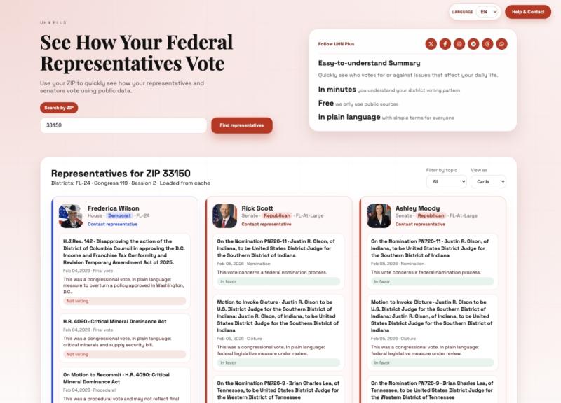 UHN Plus launched "How Do They Vote?" (English) and "?Como votan?" (Spanish), a free bilingual platform to track congressional votes. The tool allows users to enter their ZIP code to see their representatives and their voting records on key issues. The platform aims to provide accessible, non-partisan information to empower voters ahead of the 2026 midterm elections.