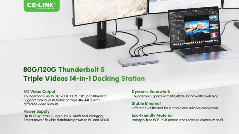 CE-LINK, the world's leading provider of intelligent connectivity solutions, officially announces the launch of its revolutionary Thunderbolt 5 docking station: the 80G/120G Thunderbolt 5 Triple Video 14-in-1 Docking Station. This groundbreaking product leverages Intel's latest Thunderbolt 5 technology to elevate the desktop connectivity experience to unprecedented heights, delivering ultimate performance for professional creators, gamers, and enterprise users.