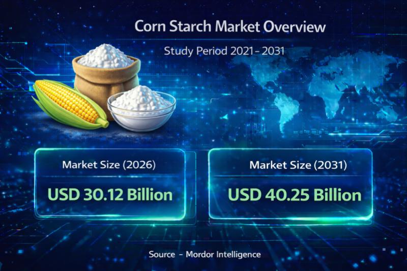 According to a research report by Mordor Intelligence, the global corn starch market size is projected to grow from USD 30.12 billion in 2026 to USD 40.25 billion by 2031, registering a CAGR of 6.89% during the forecast period. The latest corn starch market forecast reflects expanding demand across food processing, pharmaceuticals, personal care, and industrial bio-based applications.