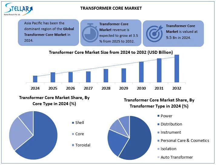 Transformer Core Market Size was estimated at USD 9.5 Bn in 2024, and it is expected to reach USD 12.61 Bn in 2032. The Market CAGR is expected to be around 3.5 % during the forecast period (2025-2032)The Transformer Core Market is gaining strong momentum as the world accelerates toward electrification, renewable integration, industrial expansion, and smart grid transformation. Transformer cores-the magnetic heart of transformers-play a critical role in minimizing power loss, enhancing energy efficiency, and ensuring stable electricity transmission across residential, commercial, and industrial infrastructures. As nations strengthen power grids, upgrade aging infrastructure, and invest in clean energy, the demand for advanced transformer cores is rising rapidly, reshaping the future of global power distribution.