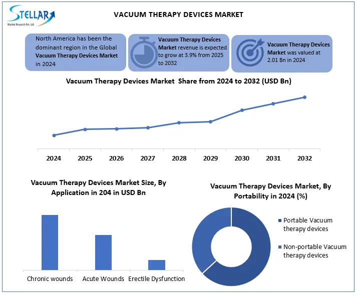 The Vacuum Therapy Devices Market was valued at USD 2.01 Bn in 2024 and is expected to reach USD 2.73 Bn by 2032, at a CAGR of 3.9% during the forecast period.