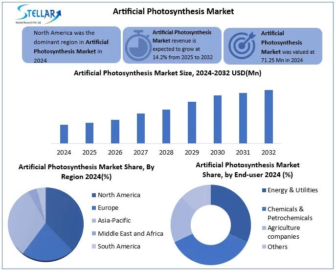 The Artificial Photosynthesis Market was estimated at USD 71.25 Mn. in 2024 and is expected to grow at a CAGR of 14.2% from 2025 to 2032, reaching nearly USD 206.12 Mn. by 2032.