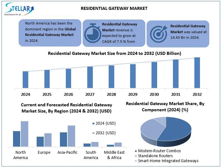 Residential Gateway Market Size was estimated at USD 14.43 Bn in 2024, and it is expected to reach USD 25.74 Bn in 2032. The Market CAGR is expected to be around 7.5% during the forecast period (2025-2032)