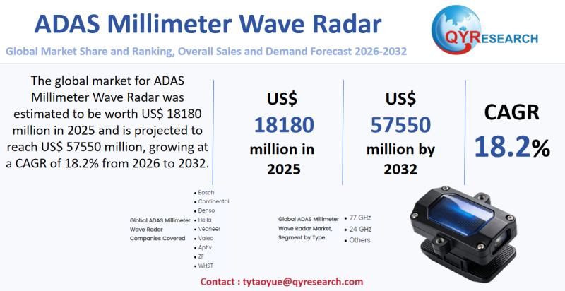 The global market for ADAS Millimeter Wave Radar was estimated to be worth US$ 18180 million in 2025 and is projected to reach US$ 57550 million, growing at a CAGR of 18.2% from 2026 to 2032.