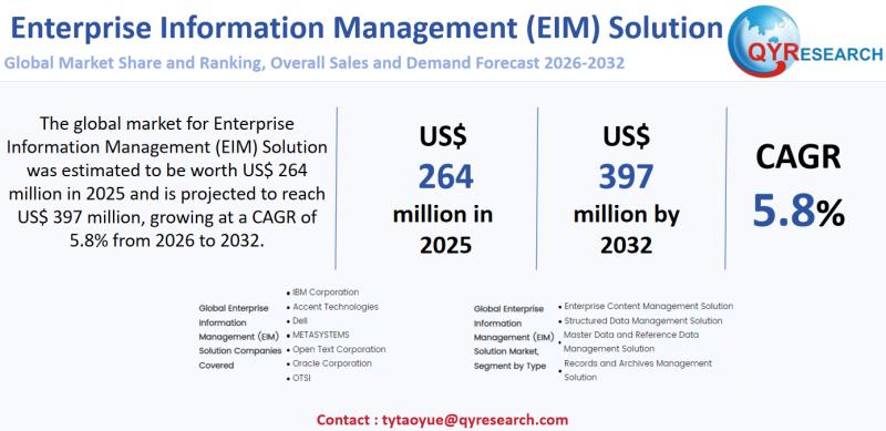 Global leading market research publisher QYResearch published the release of its latest report, "Enterprise Information Management (EIM) Solution - Global Market Share, Ranking, Sales, and Demand Forecast 2026-2032". This in-depth report provides a complete analysis of the global Enterprise Information Management (EIM) Solution market, offering critical insights into market size, share, demand, industry development status,…