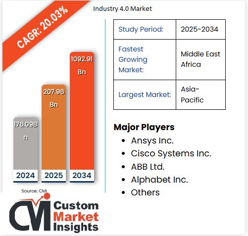 According to Custom Market Insights (CMI), The Global Industry 4.0 Market Size was valued at USD 207.96 Billion in 2025 and is estimated to reach USD 1092.91 Billion by the end of 2034 at a CAGR of approximately 20.03% during the forecast period 2025-2034.