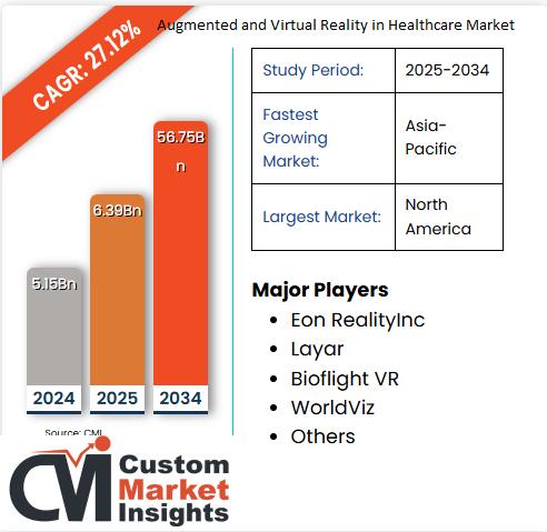 According to Custom Market Insights (CMI), The Global Augmented and Virtual Reality in Healthcare Market Size was valued at USD 6.39 Billion in 2025 and is estimated to reach USD 56.75 Billion by the end of 2034 at a CAGR of approximately 27.12% during the forecast period 2025-2034.The use of augmented reality and virtual reality in the healthcare segment will prove to be extremely beneficial. This has provided the best solutions for education in the healthcare sector. It also helps in the visualization of the veins order surgeries. With the help of augmented and virtual reality, patients can be relaxed to a great extent. Augmented and virtual reality in healthcare has helped increase patients' recovery speed.