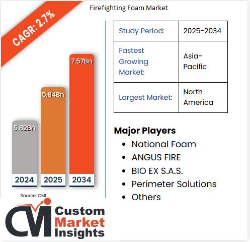 As per the Firefighting Foam Market size analysis conducted by the CMI Team, the global Firefighting Foam Market is expected to record a CAGR of 2.7% from 2025 to 2034. In 2025, the market size is projected to reach a valuation of USD 5.94 Billion. By 2034, the valuation is anticipated to reach USD 7.57 Billion.