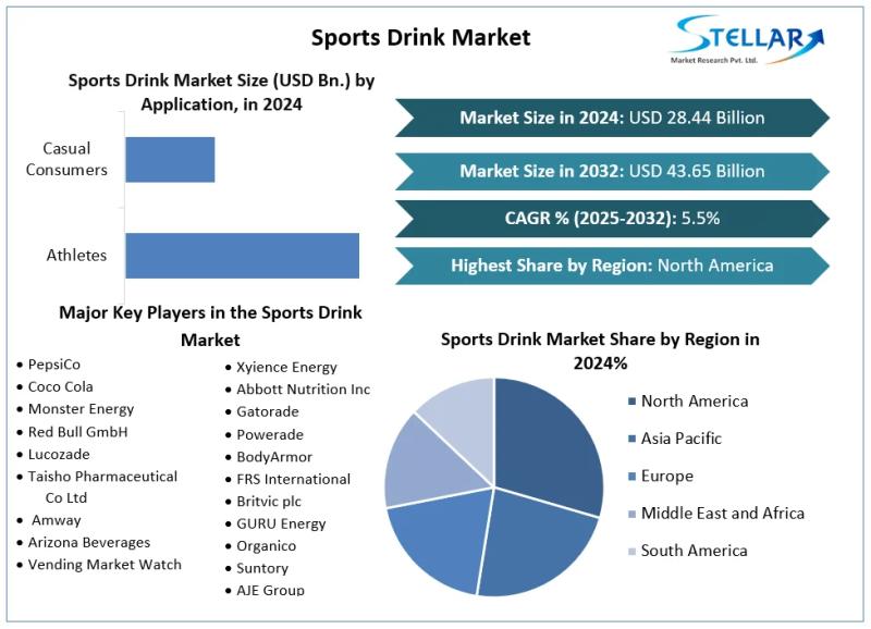 The Sports Drink Market size was valued at USD 28.44 Bn. in 2024 and the total Global Sports Drink Market revenue is expected to grow at a CAGR of 5.5% from 2025 to 2032, reaching nearly USD 43.65 Bn. by 2032.