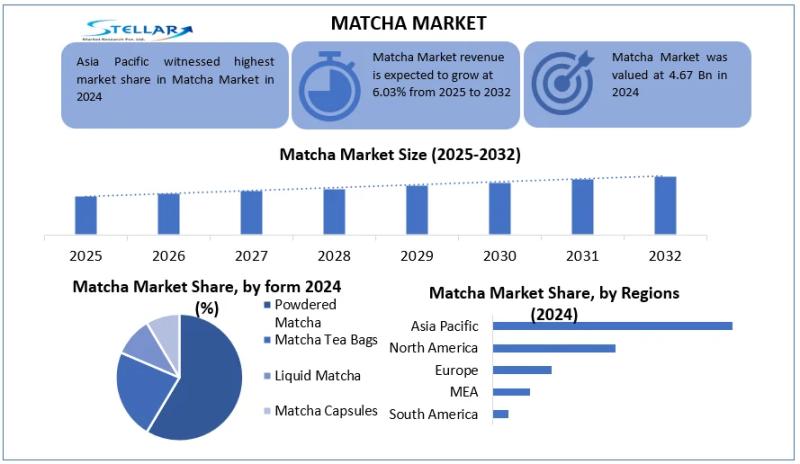 Matcha Market size was valued at USD 4.67 Bn in 2024, and the Global Matcha Market revenue is expected to grow at a CAGR of 6.03% from 2025 to 2032, reaching nearly USD 7.46 Bn by 2032.