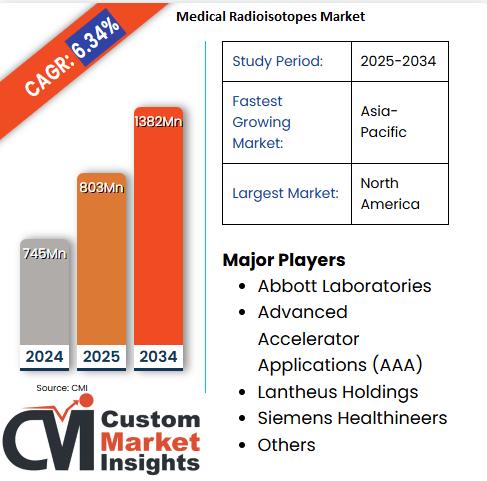 Global Medical Radioisotopes Market size was valued at USD 803 Million in 2025 and is expected to reach USD 1382 Million by 2034, at a CAGR of 6.34% during the forecast period 2025 - 2034.