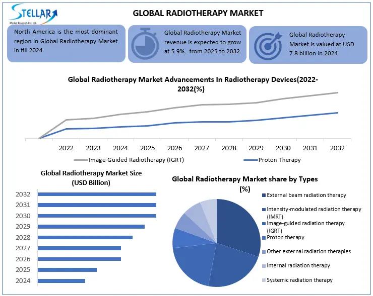 The Radiotherapy Market was expected to grow from USD 7.8 billion in 2024 to USD 12.34 billion in 2032, at a CAGR of 5.9% during the forecast period.The radiotherapy market plays a vital role in modern cancer treatment, offering highly targeted, effective, and life-saving therapy for millions of patients worldwide. Radiotherapy uses high-energy radiation to destroy cancer cells while minimizing damage to surrounding healthy tissue. With cancer incidence continuing to rise globally, radiotherapy remains a cornerstone of oncology care, used alone or in combination with surgery, chemotherapy, and immunotherapy. Technological innovation, expanding healthcare infrastructure, and increasing awareness are accelerating growth across this critical medical market.