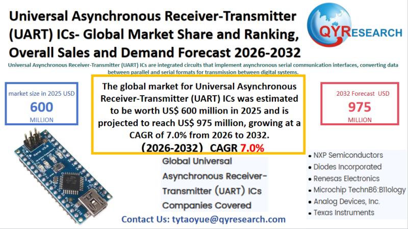The global market for Universal Asynchronous Receiver-Transmitter (UART) ICs was estimated to be worth US$ 600 million in 2025 and is projected to reach US$ 975 million, growing at a CAGR of 7.0% from 2026 to 2032.