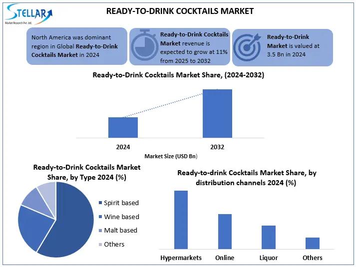 The Ready-to-Drink Cocktails Market size was valued at USD 3.5 Bn in 2024 and the total Ready-to-Drink Cocktails Market revenue is expected to grow at a CAGR of 11% from 2025 to 2032, reaching nearly USD 8.07 Bn by 2032.