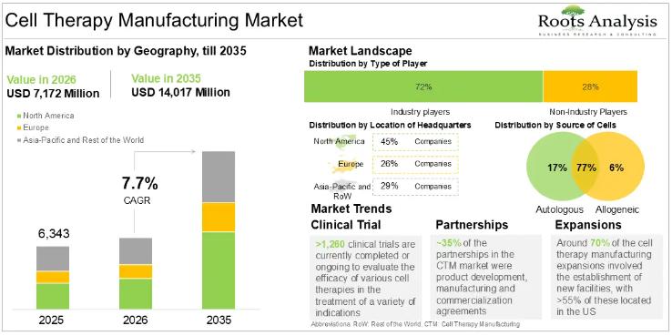 According to our latest market report "Cell Therapy Manufacturing Market by Type of Cell Therapy, Source of Cells, Scale of Operation, Type of Manufacturer and Key Geographical Regions: Industry Trends and Global Forecasts, 2023-2035", the global cell therapy manufacturing market size is projected to reach USD 14,017 million by 2035 from USD 6,343 million in 2025, growing at a CAGR of 8.25% in the forecast period 2025-2035.To request quote of this report, please visit: