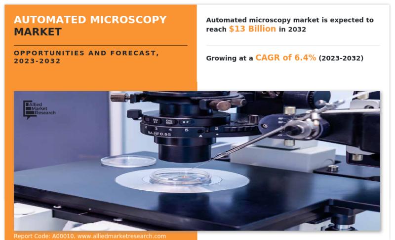 According to a report published by Allied Market Research titled "Automated Microscopy Market by Product, Application, and End User: Global Opportunity Analysis and Industry Forecast, 2023-2032," the global market was valued at $7,102.4 million in 2022 and is projected to reach $13,041.8 million by 2032, registering a CAGR of 6.4% during the forecast period.