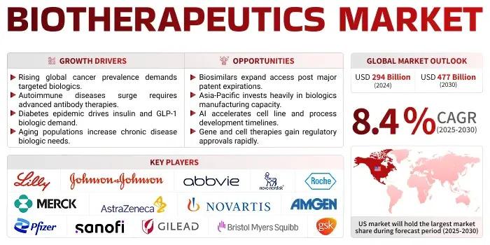 The global biotherapeutics market was valued at USD 294 billion in 2024 and is projected to reach USD 477 billion by 2030.