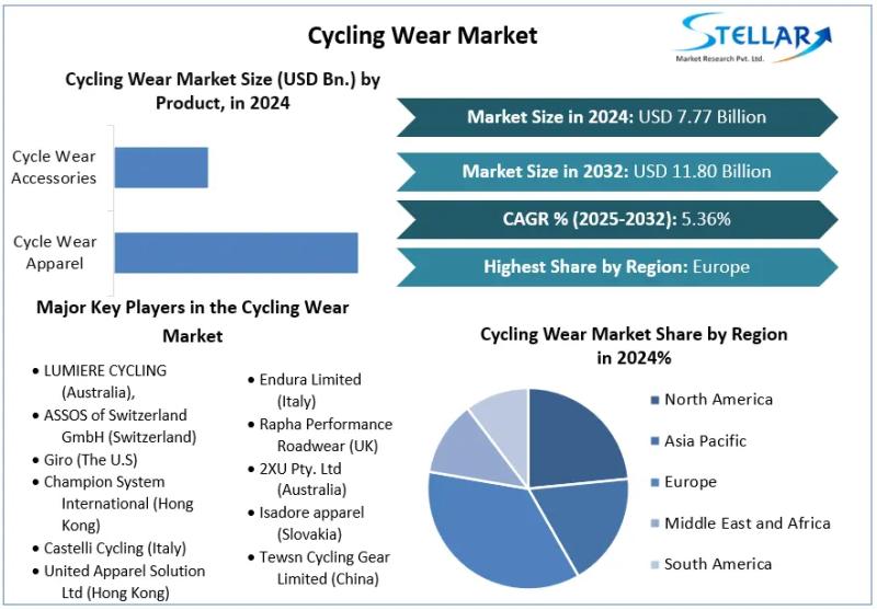 Cycling Wear Market Expected To Reach USD 11.80 Billion 2032, at a CAGR of 5.36 % To Forecast 2025-2032